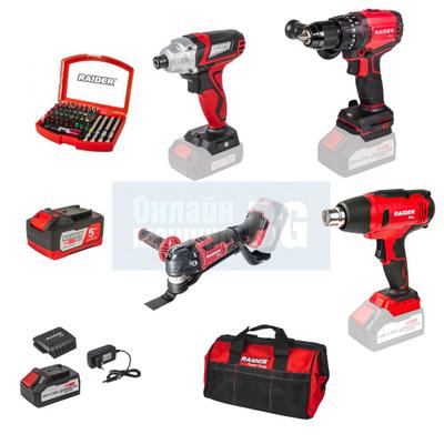 Комплект акумулаторни машини Raider RDP-BXS6, R20, 20 V, 4 Ah, 5 Ah, с батерии, зарядно и аксесоари