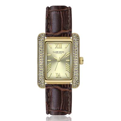 Правоъгълен часовник с кожена каишка и кристали, Тъмнокафяв Clare Moss