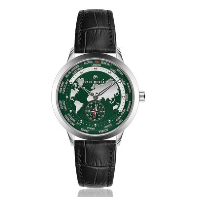 Часовник с множество часови зони и кожена каишка, Черен Paul McNeal