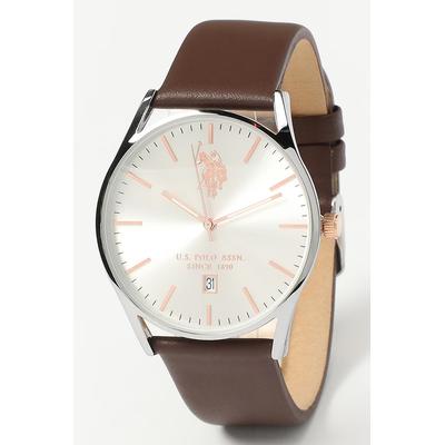 Часовник с кожена каишка, Сребрист/Тъмнокафяв U.S. Polo Assn.
