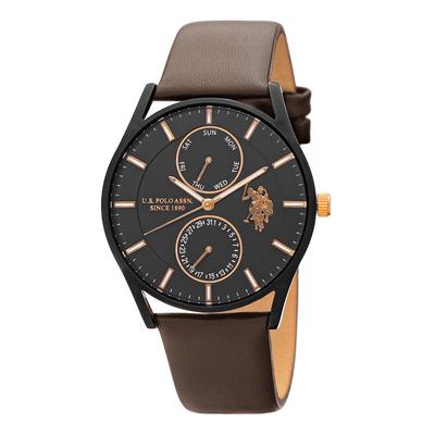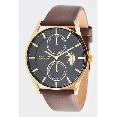 Мултифункционален часовник с кожена каишка, тъмнокафяв, Тъмнокафяв U.S. Polo Assn.