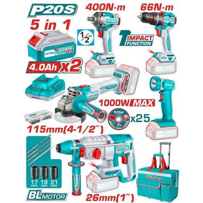 Комплект акумулаторни инструменти Total Industrial 5в1 / 20V с 2 батерии, зарядно, чанта и аксесоари
