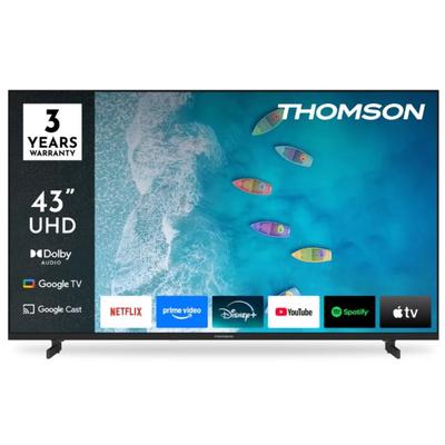 Телевизор Thomson 43" UHD Google TV, 3840 x 2160 (4K UHD), DLED, 60 Hz, Dolby Audio, Google Cast, DVB-T/T2/C/S/S2, HDR10, Wi-Fi, Bluetooth, LAN, HDMI 3 (2.1), USB 2 (2.0), AV IN, Hotel mode, Side Feet, Black 43UG4S15