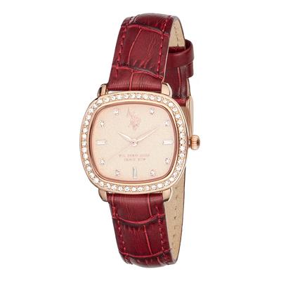 Часовник с кожена каишка и кристали, Златист/Бордо U.S. Polo Assn.