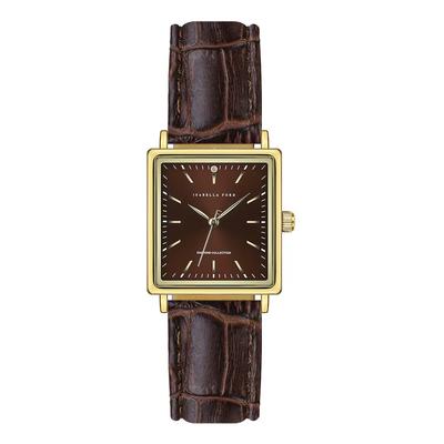 Правоъгълен часовник с кожена каишка, Златист/Канела Isabella Ford
