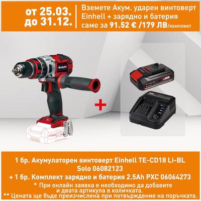Акумулаторен ударен винтоверт Einhell TE-CD18 Li-BL Solo+куфар свредла70ч